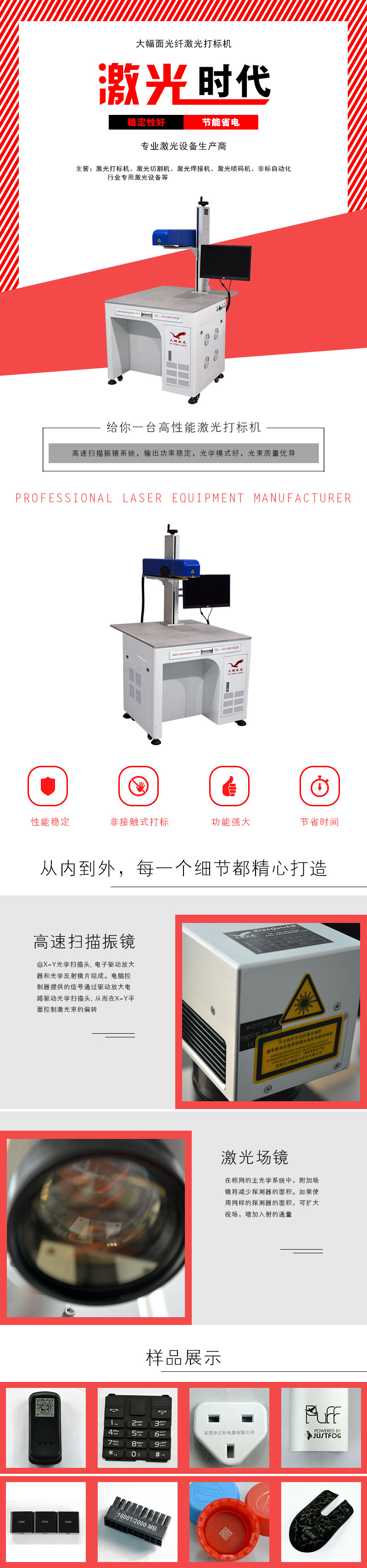 应用领域:广泛运用于集成电路芯片、电脑配件、工业轴承、钟表、电子及通讯产品、航天航空器件、家电、五金工具、模具、电线电缆、食品包装、首饰、烟草及军事用途等众多领域图形和文字的标记。产品优势: