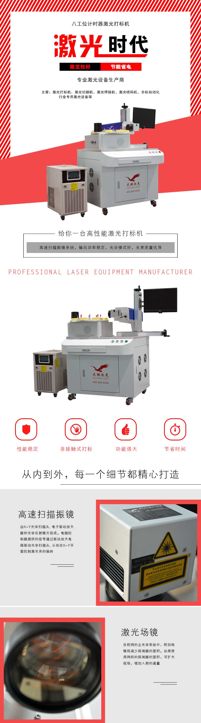 利用高速扫描镜片可以在很短的时间完成图像扫描,完成精美的标记;设计合理,做工精细,外观高档;可根据用户要求配置数控旋转头、自动夹具、上下料生产线;自动完成日期、流水号,可标刻条型码;可进行数据通讯、联网。