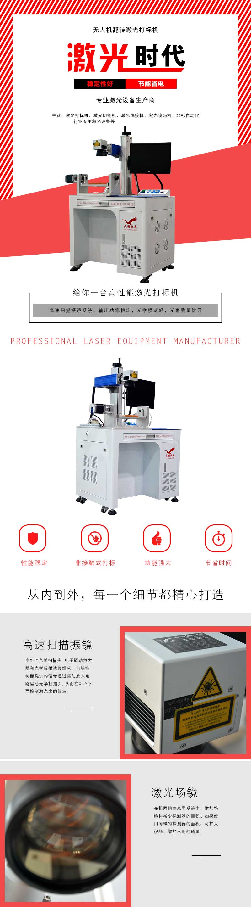 • 采用高功率多模激光二极管为泵浦源,掺镜双包层光纤作为激光介质,光束由光纤传输,经X、Y扫描镜片控制光束的高速运动(其速度是传统打标机的3倍以上);