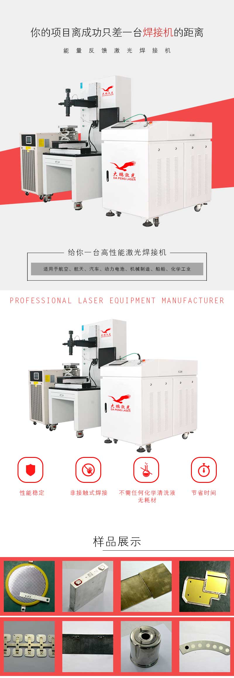 大型模具、电子元器件、光通信器件、IT、医疗、电子、电池、光纤耦合器件、显像管电子枪、金属零件、手机振动马达、钟表精密零件、汽车钢片等的精密焊接。
