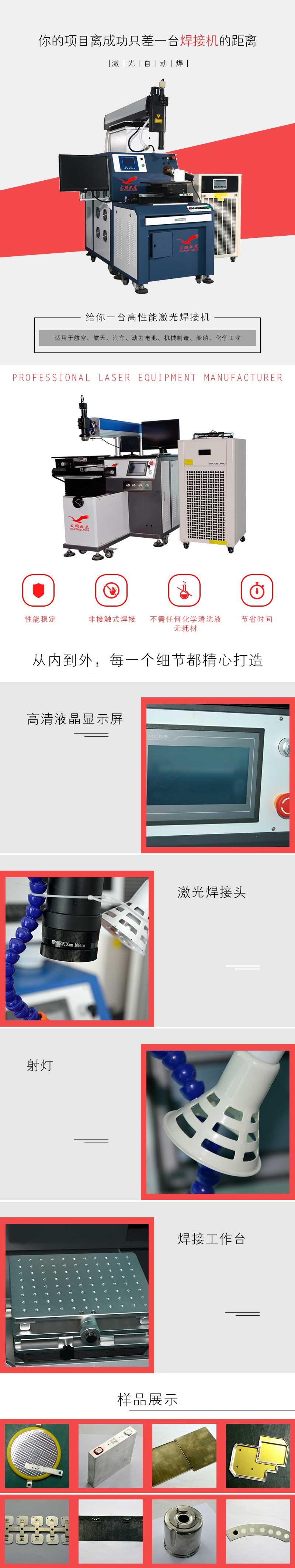 产品优势:激光焊接机广泛应用于牙科义齿的加工,键盘焊接,矽钢片焊接,传感器焊接,电池密封盖的焊接等方面;
